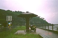 我慢の走行で松前まで。立派な休憩所で雨宿り。